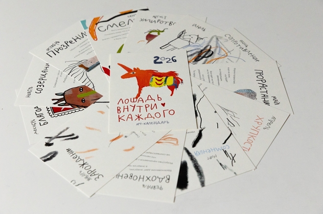 В ноябре наш мерч продавался в зоне Щедрого Вторника на ярмарке «Flowwow Market», а также на открытии выставки современного искусства «Побочные эффекты повседневности». Особой популярностью у покупателей пользовался арт-календарь «Лошадь внутри каждого», созданный художниками школы современного искусства Suninbun по мотивам картины «Единорог» нашего Миши Хандажинского.