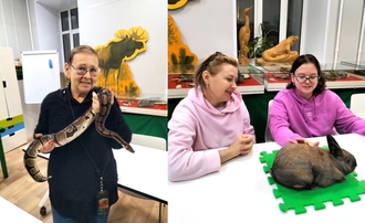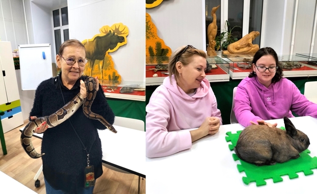 Кроме осьминога, в ноябре ребята на занятиях увидели утку, двух кроликов, одного из которых зовут Шарфик, морскую свинку, белую крысу, змею, петуха, черепаху, голубя, сцинка и двух питонов.